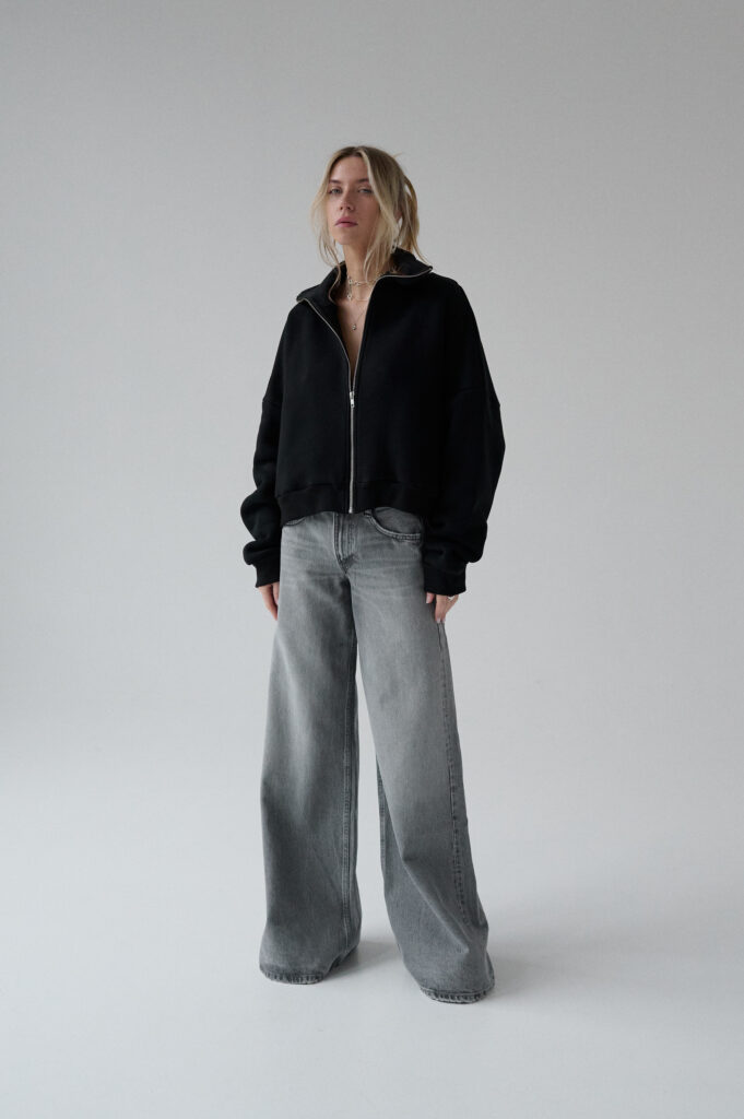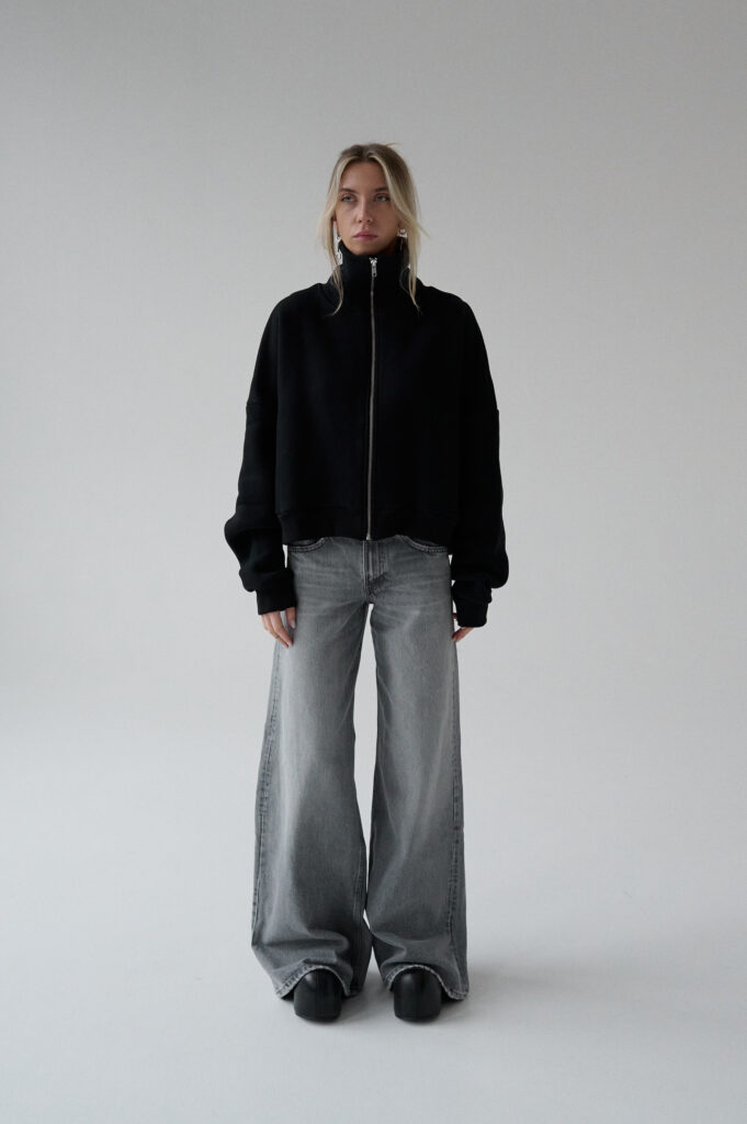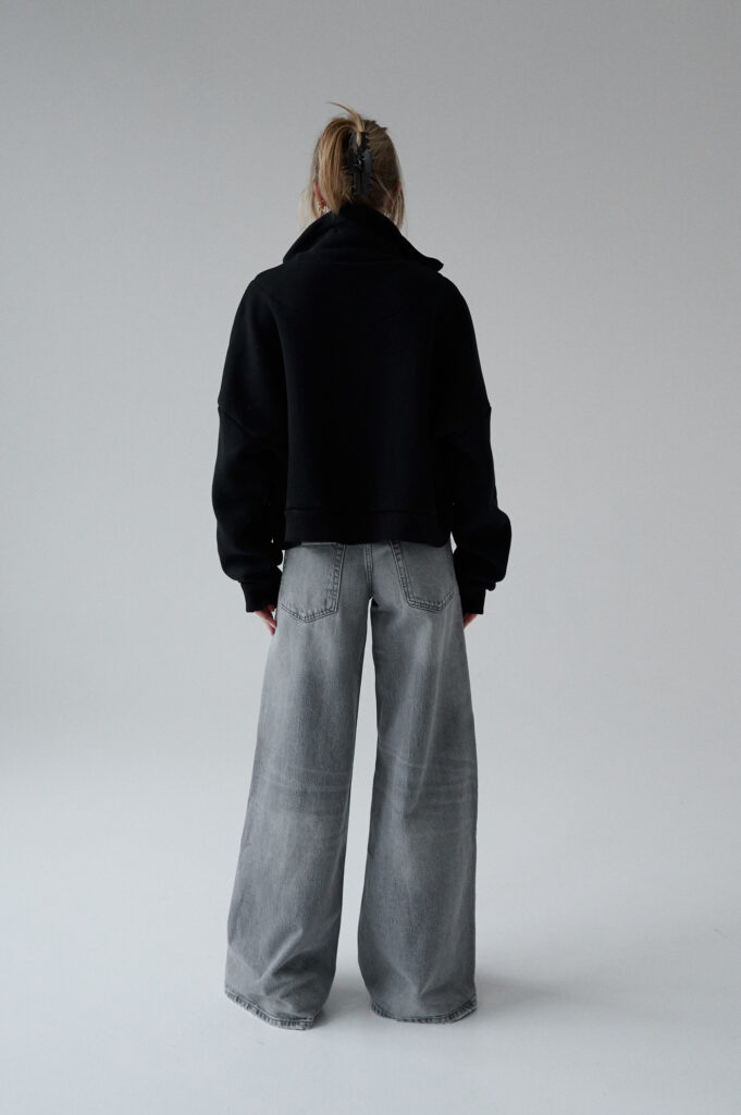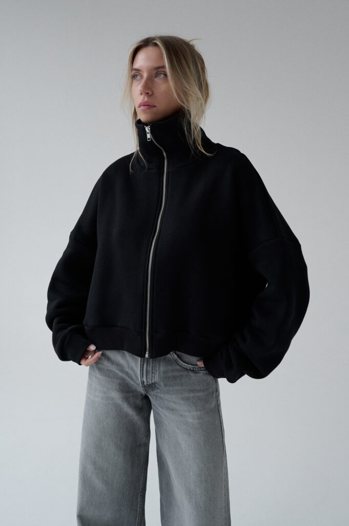 Juodas džemperis aukštu kaklu su užtrauktuku. Modelis dėvi XS/S dydį. Modelio ūgis 168cm. Pagaminta LT.